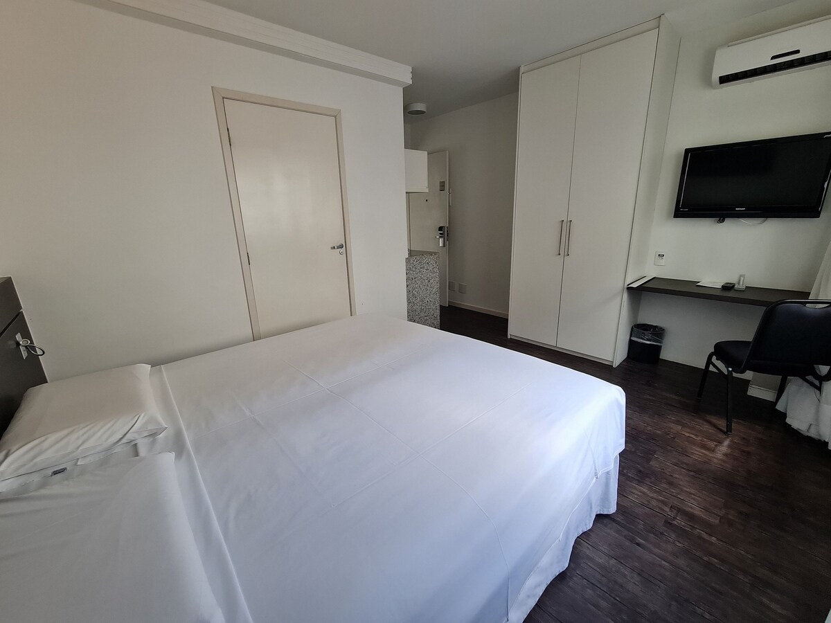 Aqui, tudo é fácil e prático, do início ao fim da sua estadia! O imóvel foi muito bem montado e pensado para proporcionar a melhor experiência possível. Possui uma cama de casal, fornecendo uma sensação de amplitude. É um bom lugar para renovar a energia. É um quarto amplo, mesmo sendo sem varanda. Roupas de cama, 2 travesseiros, 2 toalhas e uma coberta de casal estão inclusas na reserva. Tudo o que você precisa para uma boa estadia