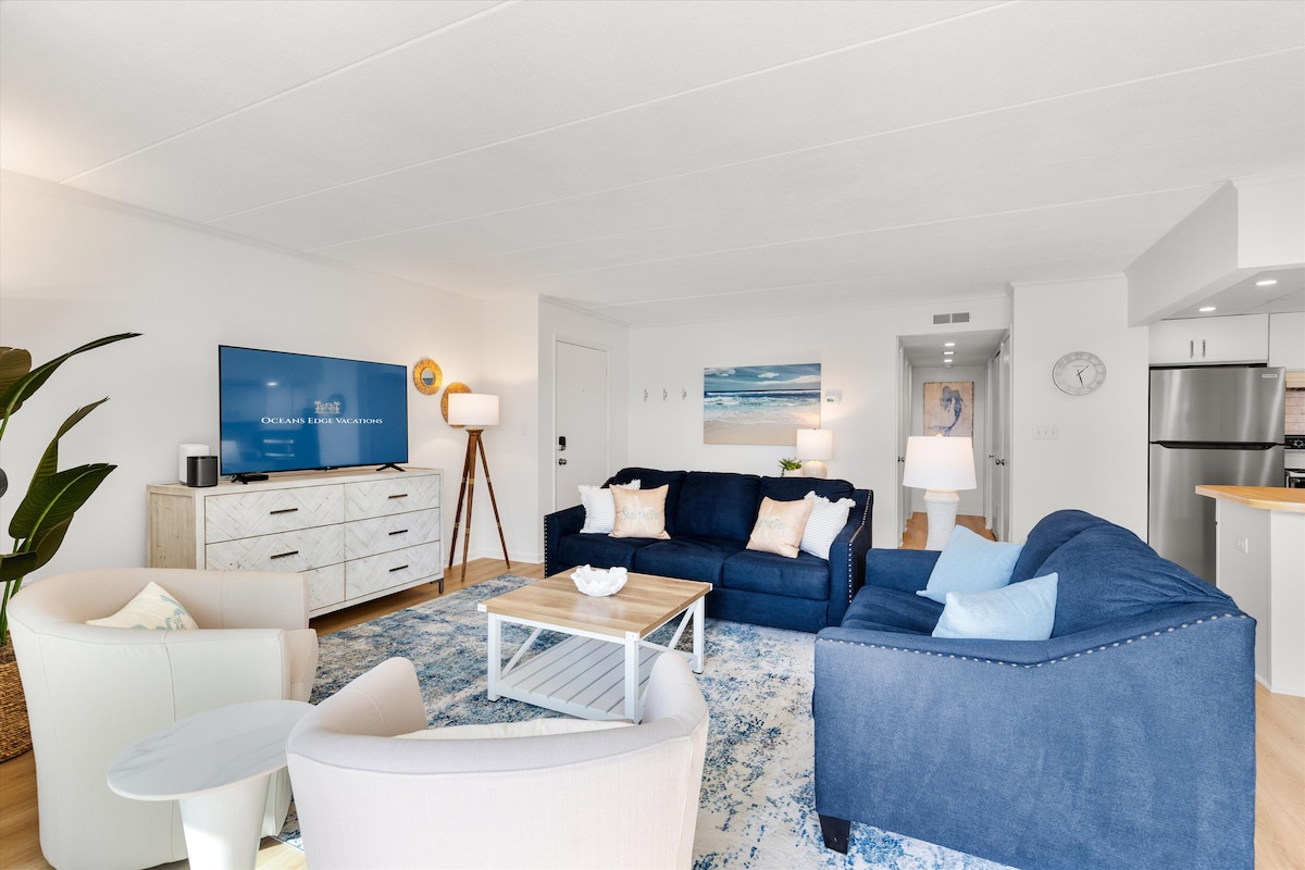 Your family will be close to everything when you stay at this beautiful condo located right on the beach with expansive balcony views of both ocean and bay. With the best amenities around, this year-round rental is equipped with an enormous indoor pool, basketball and tennis courts, shuffleboard, saunas, gym, library, sun deck, & game room with arcades, claw machines, billiards, and air hockey tables. This 2-bedroom unit comfortably sleeps 6 which makes it ideal for families or couples alike.