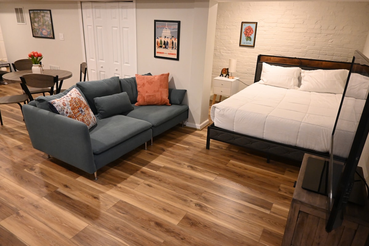 Tágas, meglepően világos Bethesda fél-alagsorunk egy csendes környéken található, mindössze néhány percre Walter Reedtől, az NIH-tól és a metrótól. A nagy ablakok kilátást nyújtanak egy hortenziákkal és örökzöldekkel szegélyezett teraszra; a hálószobában queen méretű ágy, Samsung okostévé és íróasztal található. A fürdőszobában található Kohler zuhanyfej erős nyomást biztosít, a minihűtő és mikrohullámú sütő pedig a rágcsálnivalókhoz áll rendelkezésre. Rövid távú szálláskiadási engedély száma STR25-00162. Kérlek, vedd figyelembe, hogy nincs konyha és nincs mosógép/szárítógép.