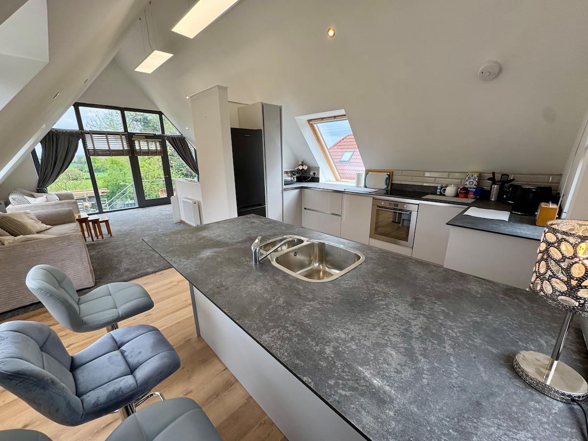 Romantic luxury loft for two on a 40-acre private estate in the Wye Valley National Landscape. Perfect for honeymooners, stargazers, proposals, anniversaries, or milestone moments. Enjoy panoramic Mork Valley views through the feature arched window, vaulted oak beams, and a cozy fire pit (logs & marshmallows incl.). Includes a generous welcome hamper and exclusive access to our dark skies, meadows, stream, and woodland. A peaceful, magical retreat with high-end, curated experiences available.