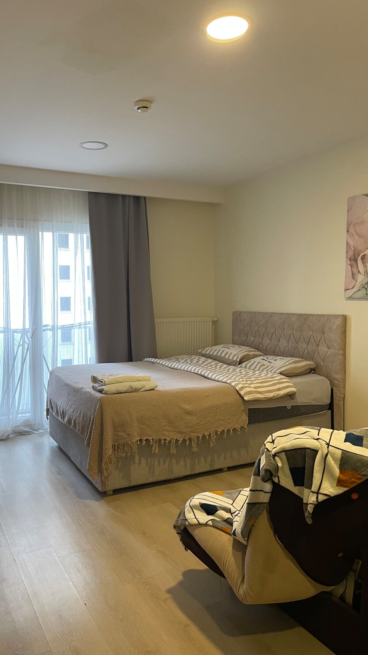 Ez a gyönyörűen berendezett földszinti lakás ötvözi a kényelmet és az eleganciát, és békés menedéket kínál Isztambul csendes részén. A meleg tónusokkal és modern részletekkel átgondoltan berendezett helyen minden alapvető dolog megtalálható: teljesen felszerelt konyha, nagy sebességű Wi-Fi, hangulatos nappali és nagy terasz kültéri ülőhellyel – sétatávolságra a Fuar Tuyaptól, az Avenue Malltól és a metróbuszvonaltól.