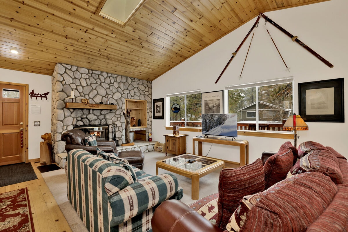 This modern cabin is perfect year-round and walkable to the lake, Alpine Sled Park, and Big Bear Brewery. Just a mile from the Village and minutes to the slopes! Features an open-concept layout with a large kitchen island, a custom game room with arcade games and many more/ The backyard features a hot tub, firepit, and grill—perfect for relaxing after a day of fun. Public lake access is about half a mile from the cabin.