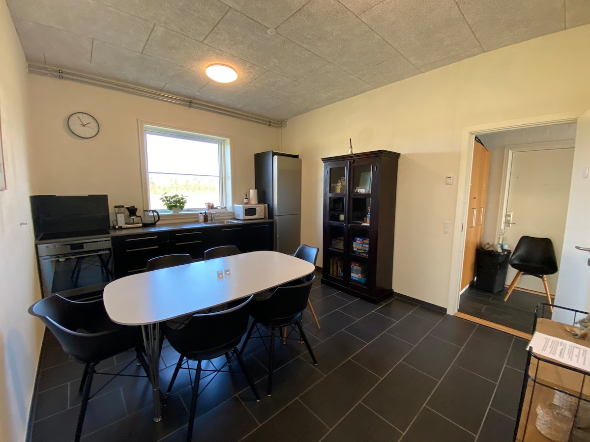 Privát lakás csendes környezetben, egy fantasztikus természeti területen. A lakás új építésű, és a főépülethez képest különálló (privát). Minden újnak és rendezettnek tűnik. Saját parkolója és nagy területe van, ahol a gyerekek szabadon játszhatnak a játszóházzal, a focipályával és a focigolfpályával. Jó földrajzi elhelyezkedés. Csak 25 percre található a Legolandtól, 7 percre a Givskud Állatkerttől és 1,5 km-re a Jelling Múzeumtól (város) és a vásárlási lehetőségektől.