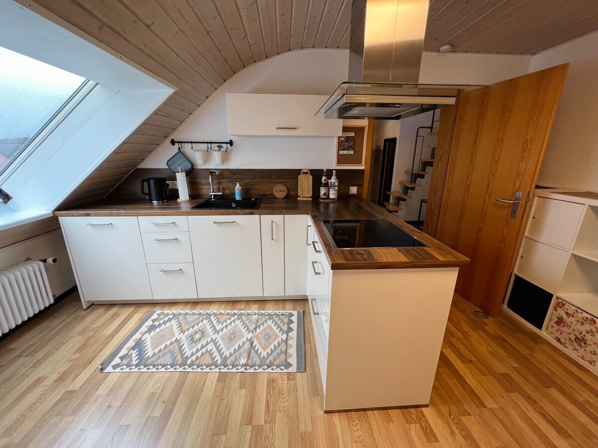 Szeretettel kialakított tetőtéri lakásunk egy 16. századi parasztházban csendes és központi elhelyezkedésű. A gyönyörű erdőkben vagy az idilli Rajna partján tett kiterjedt sétákkal, ahol számos fürdőhely található, pihenhetsz. 5 perc alatt sétálhatsz éttermekhez, szupermarketekhez, úszómedencéhez és vasútállomáshoz. A Jestetten ideális kiindulópont olyan kirándulási célpontokhoz, mint a Fekete-erdő, a Constance-tó/Konstanz, a Zürich és az Alpok. A Zürichbe és Schaffhausenbe tartó vonatok félóránként közlekednek.