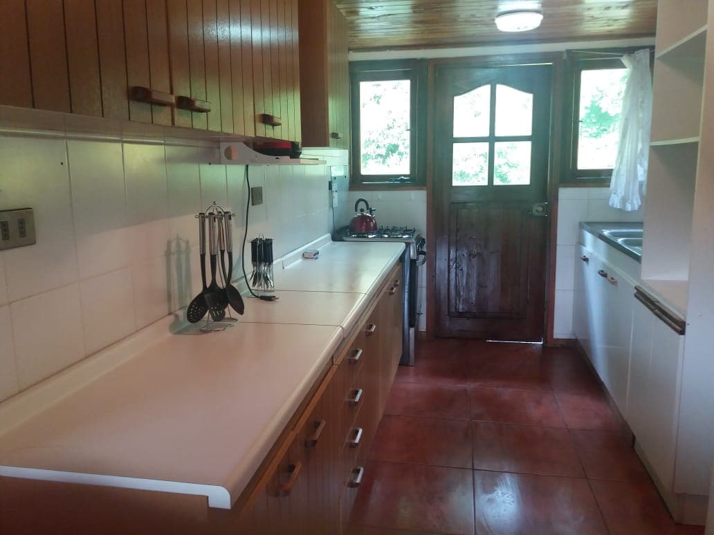 Encantadora casa de campo de dos pisos, situada en hermosa parcela que cuenta con las comodidades de la ciudad (luz eléctrica, agua potable y TV satelital) y la belleza natural del bosque nativo, huerta, jardines y quinta de árboles frutales. 4 dormitorios, 2 baños, living, comedor, estar, terrazas y una amplia cocina con un segundo comedor de diario. Completamente equipada. 3 estufas (dos a combustión lenta) y piscina habilitada en verano. Garage techado para dos vehículos, lavandería.