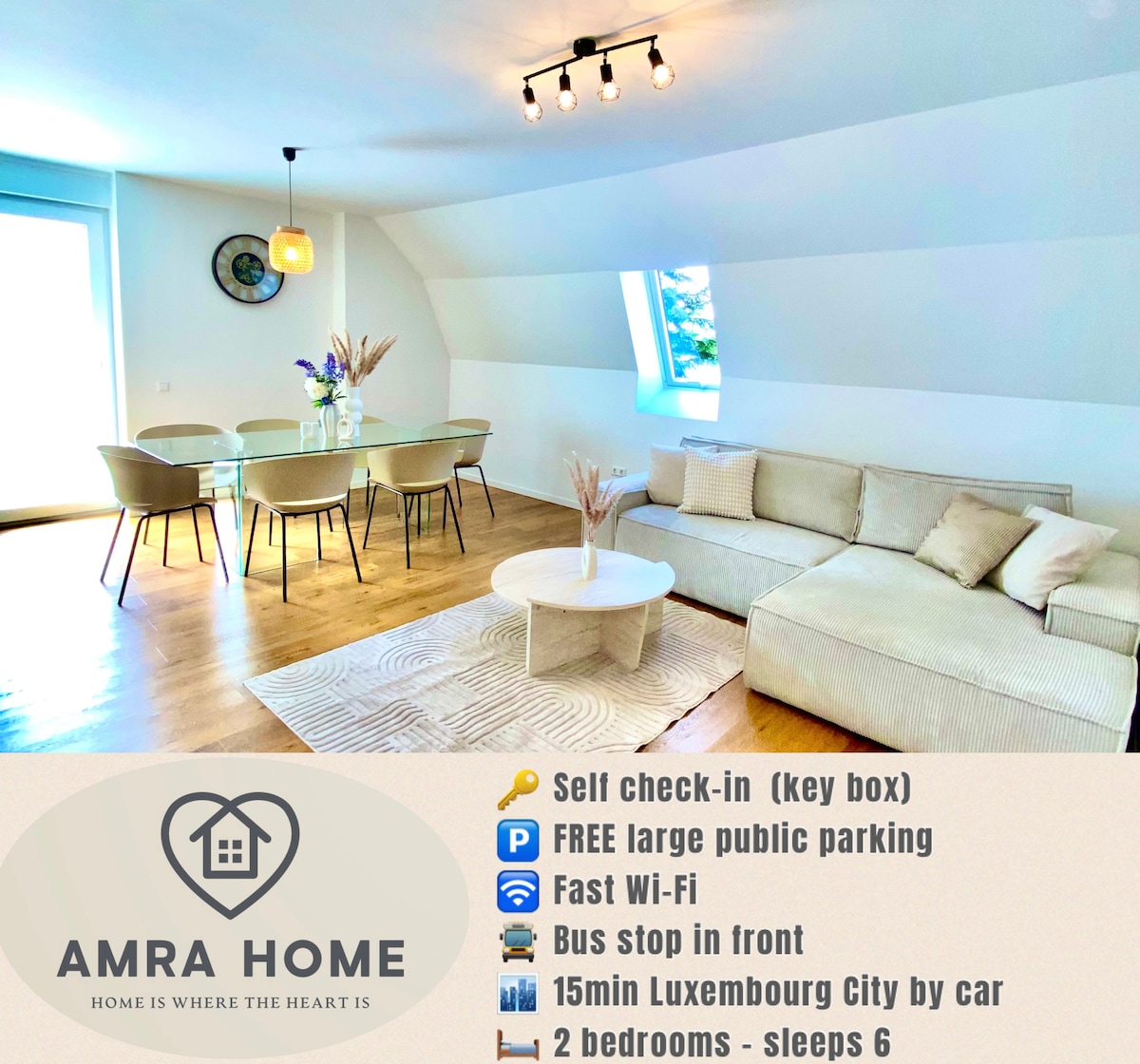 Modern lakás Luxemburgban, közel minden kényelmi szolgáltatáshoz, 2 hálószobával és 2 franciaággyal. Tágas nappali, teljesen felszerelt konyha, 2-5 személy elszállásolására alkalmas. Fürdőszoba zuhanyzóval és fürdőkáddal, mosógép/szárítógép, ingyenes parkolás. Szép erkély, ingyenes tévé és Wi-Fi. Buszmegálló a ház előtt. Törölköző és ágynemű biztosított. Ideális a kényelmes városi tartózkodáshoz, számos étteremmel és üzlettel a közelben.