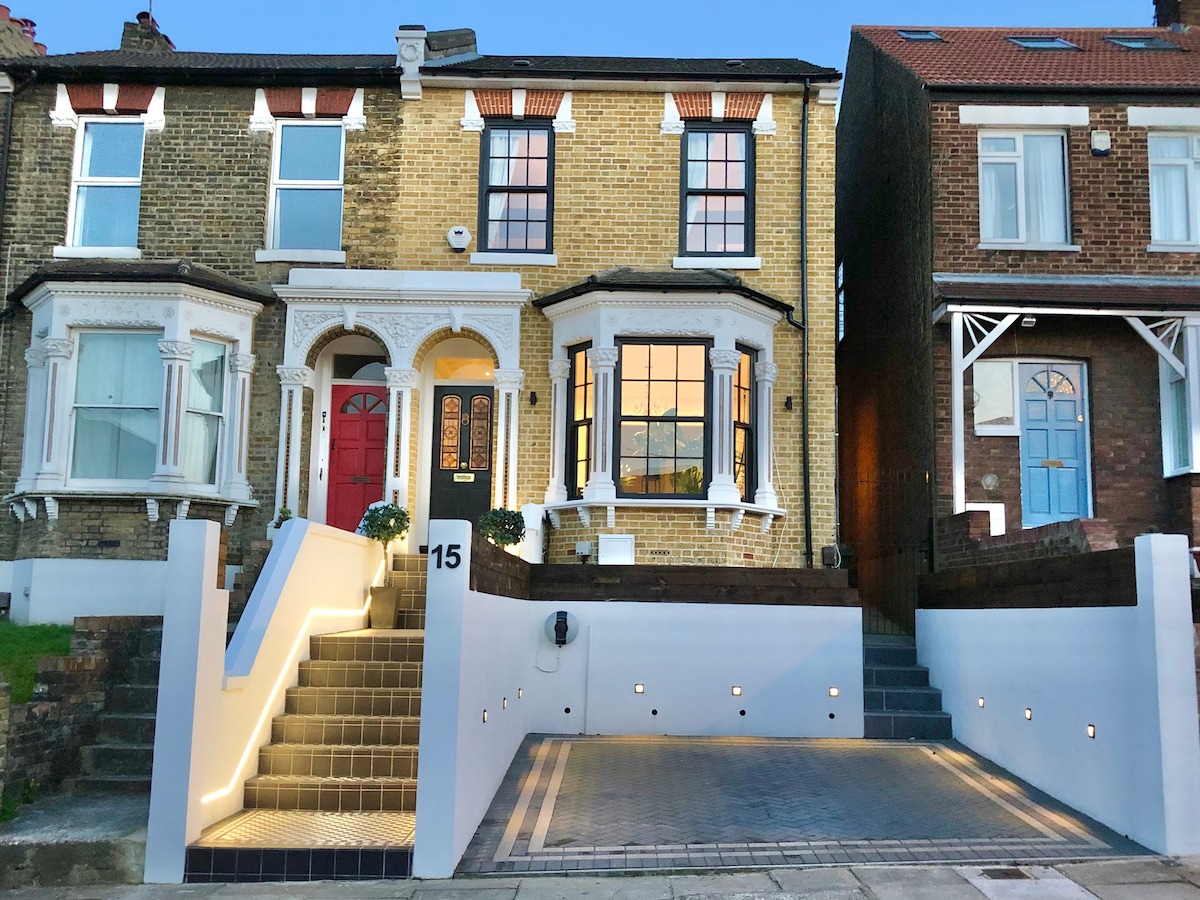 WELCOME TO OUR BEAUTIFUL HOME! Perfect for families and large groups (up to 10). The entire home and gardens will be all yours. Recently renovated with 4 comfortable bedrooms (2 with en-suite), a big kitchen for socialising in and a Mediterranean-style gardens located on a quiet residential road. We are 20 min walk to Woolwich Station. From here you can get to the Excel (4mins), Canary Wharf (8mins), Liverpool St (15mins), Tottenham Court Rd (20mins), Paddington (26mins), Heathrow (50mins).