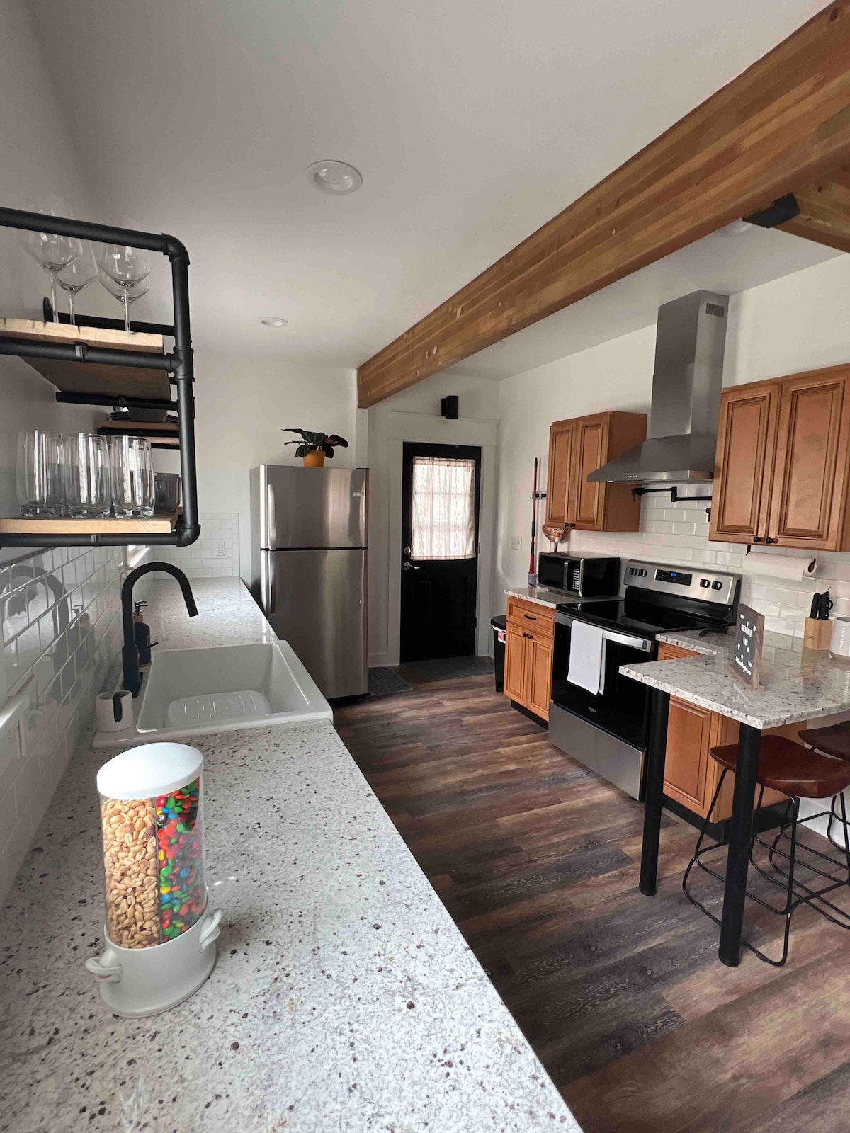 First floor studio features a king bed and full sofa sleeper. This unit has stainless steel appliances, quartz countertops, microwave, Keurig coffee maker, Iron, washer/dryer and on-site parking. Conveniently located to downtown La Grande, Eastern Oregon University and Grande Ronde Hospital.