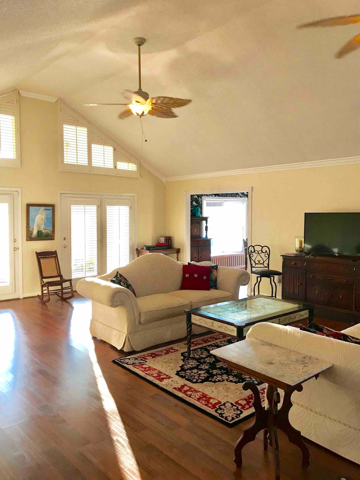 Ez a nyugodt, privát folyami menedék hihetetlen kilátást nyújt a mocsárra és a Beaufort folyóra. A népszerű Pigeon Pointban található szálláshely csak egy rövid biciklizésre vagy 20 perces sétára fekszik a történelmi negyedtől és Beaufort belvárosától. Van egy másik, elbűvölőbb és egzotikusabb ingatlanom is a szomszédban: airbnb.com/h/motm Élvezd a horgászást és a rákhalászást közvetlenül a hátsó udvarodban dagálykor, vagy sétálj le egy rövid sétát a partraszállásig, ahol nézheted, ahogy az emberek kézzel vetik a garnélarákot!
