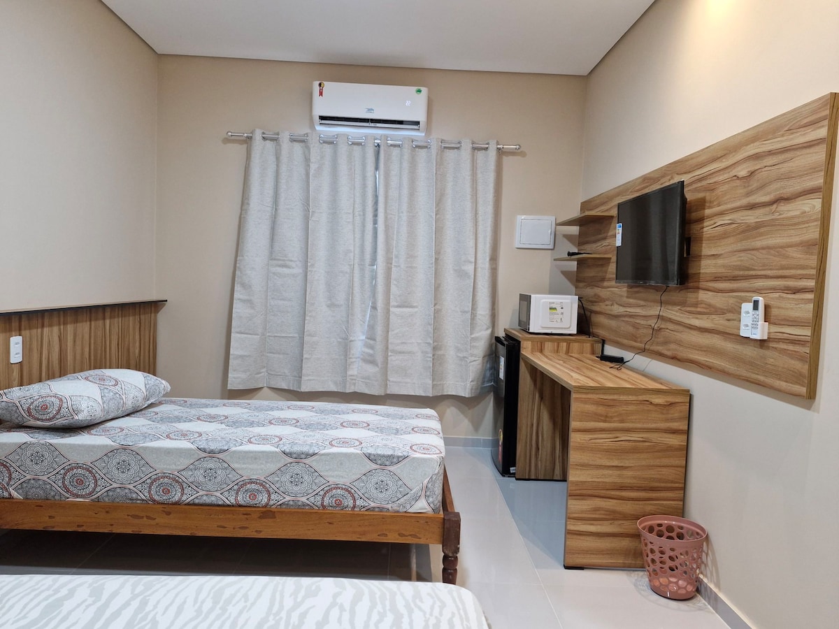 Egyéni lakás, félig rusztikus, nagy, légkondicionált és kényelmes hellyel, amely a következőket tartalmazza: franciaágy, hack, TV Smart 43", fából készült arapagáj cipőtartóval, kis szekrény. Asztal székekkel, minibár, szekrény háztartási eszközökkel, elektromos tűzhely (2 száj), mikrohullámú sütő, légsütő serpenyő, szendvics és turmixgép. Wi-Fi-vel rendelkezik, és jó helyen található, körülbelül 5 percre az Int de Boa Vista repülőtértől, közel egy szupermarkethez, gyógyszertárakhoz, edzőtermekhez, főiskolákhoz, újságokhoz stb.