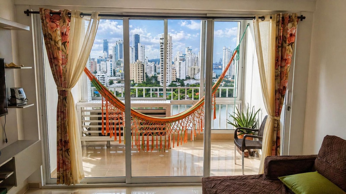Disfruta un elegante apartamento frente al mar en Bocagrande, con vista directa al Caribe. Cuenta con 2 habitaciones, 2 baños, sala amplia con sofá cama, cocina totalmente equipada, WiFi de alta velocidad y balcón privado con sillón colgante. Aire acondicionado en todas las áreas. Perfecto para familias y grupos que buscan comodidad, ubicación privilegiada y acceso inmediato a la playa. Todo está pensado para una estancia moderna, práctica y relajante.