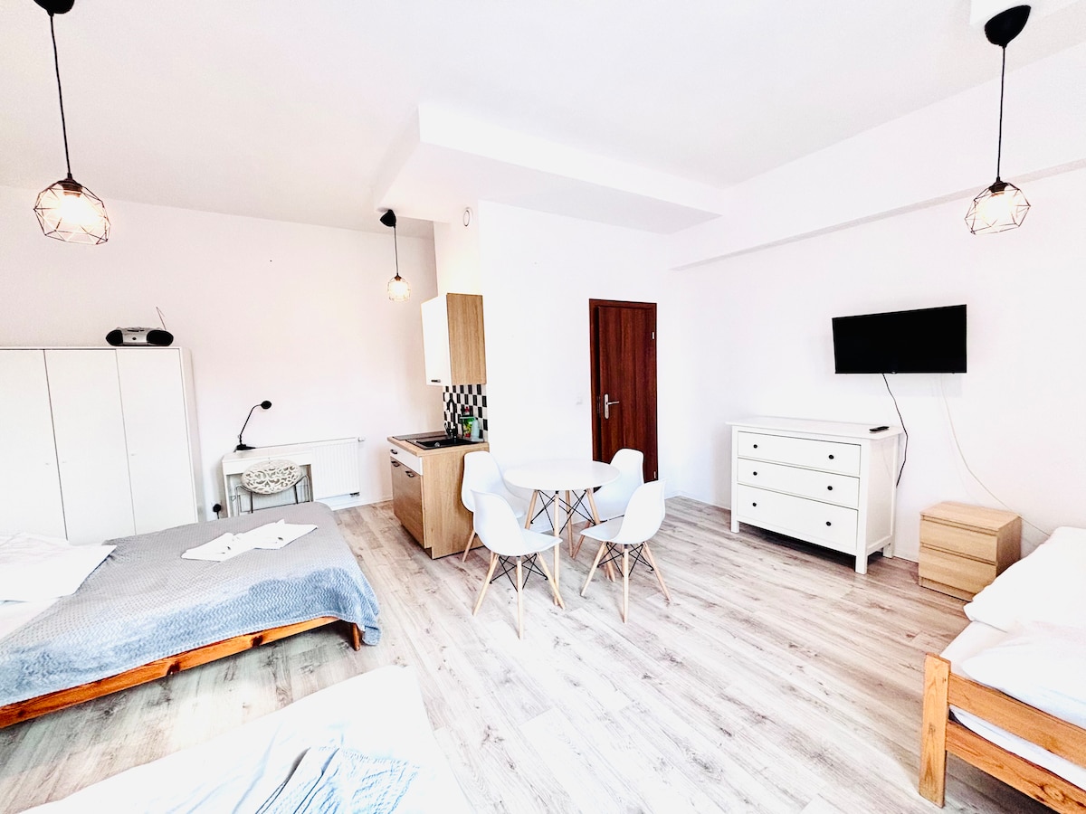 Meghívunk egy teljesen felszerelt, barátságos stúdióapartmanba, ahol akár 2 személy is elfér. Piactérre néző kilátás, kényelmes ágyak, wifi, tűzhely, sütő, hűtőszekrény, munkaterület. Fürdőszoba zuhanyzóval és mosógéppel. Lehetséges babaágy 3 éves korig.