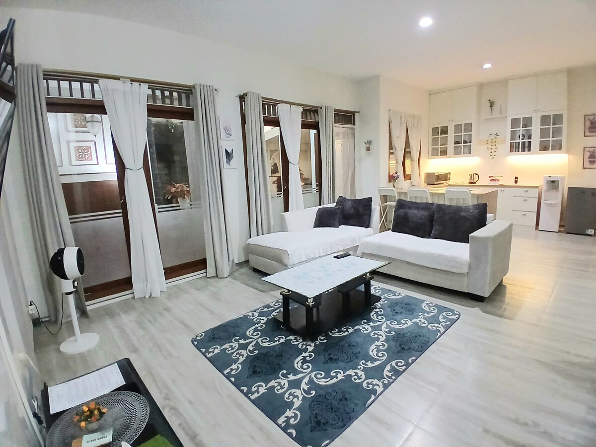 Békés, 3 hálószobás villánk (130 m²) tökéletes pihenőhely családok vagy barátok számára (legfeljebb 6 vendég). Pamoyananban található, mégis csak néhány percre Bogor központjától, és a nyugalom és a kényelem ideális keverékét kínálja. A villa egy privát, biztonságos lakóépületben található, nonstop biztonsági szolgálattal és biztonsági kamerákkal, és minden modern kényelmet biztosít, okostévét is, amelyen Netflix és YouTube is elérhető. Pihenj a saját erkélyeden, és gyönyörködj a lenyűgöző kilátásban a hegyekre. A lakástól mindössze 2 perc sétára található egy kisbolt és egy ATM.