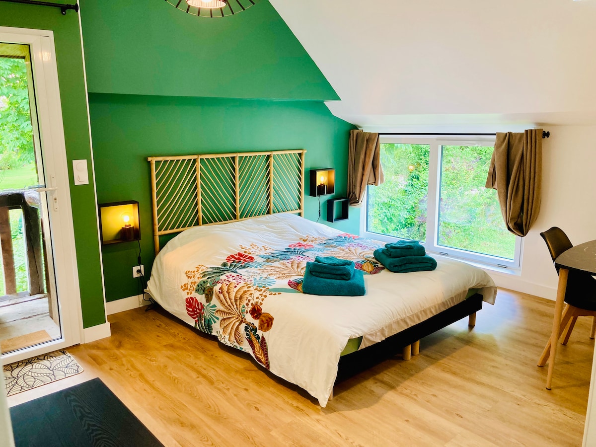 Chez Arsachuly és Jason - Ebből a Normandia szívében található bájos házból, egy külső lépcsőn keresztül, amely csak neked van fenntartva, 45m2-es privát helyiségbe léphetsz be a kényelmed érdekében. Két hálószobád lesz, amelyek az erdős kertre, a fürdőszobára, a vécére és a kávézó területére néznek. A szabadidődben élvezheted 🌳 a kertet, felolvashatod a madárdalt🐦, kávézhatsz a napon, ☀️ vagy piknikezhetsz a fűben🥪.