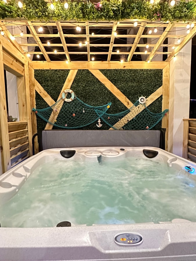 Gyerekbarát hátsó udvar, pezsgőfürdő és tikibár