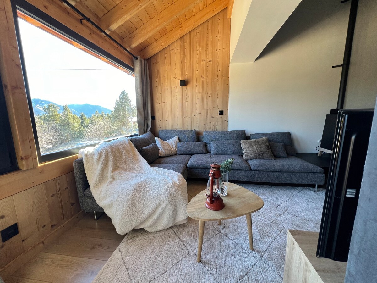 Kortárs stílusú faház a Font Romeu síparadicsomban, a katalán Pireneusokban, panorámás kilátással a hegyekre. déli fekvésű🌞. 10 fő. 3 hálószoba 2 zuhanyzószoba- 3 wc garázs 1 jármű 2 parkolóhely a faház előtt (összesen 3 hely) kert 3 személyes szauna pelletkályha minősített bútorozott idegenforgalmi ingatlan ⭐⭐⭐⭐⭐ Felhívjuk figyelmedet, hogy a hét folyamán reggel 8 és délután 5 óra között más közeli faházak még építés alatt állnak, és zajszennyezést okozhatnak (építkezések)