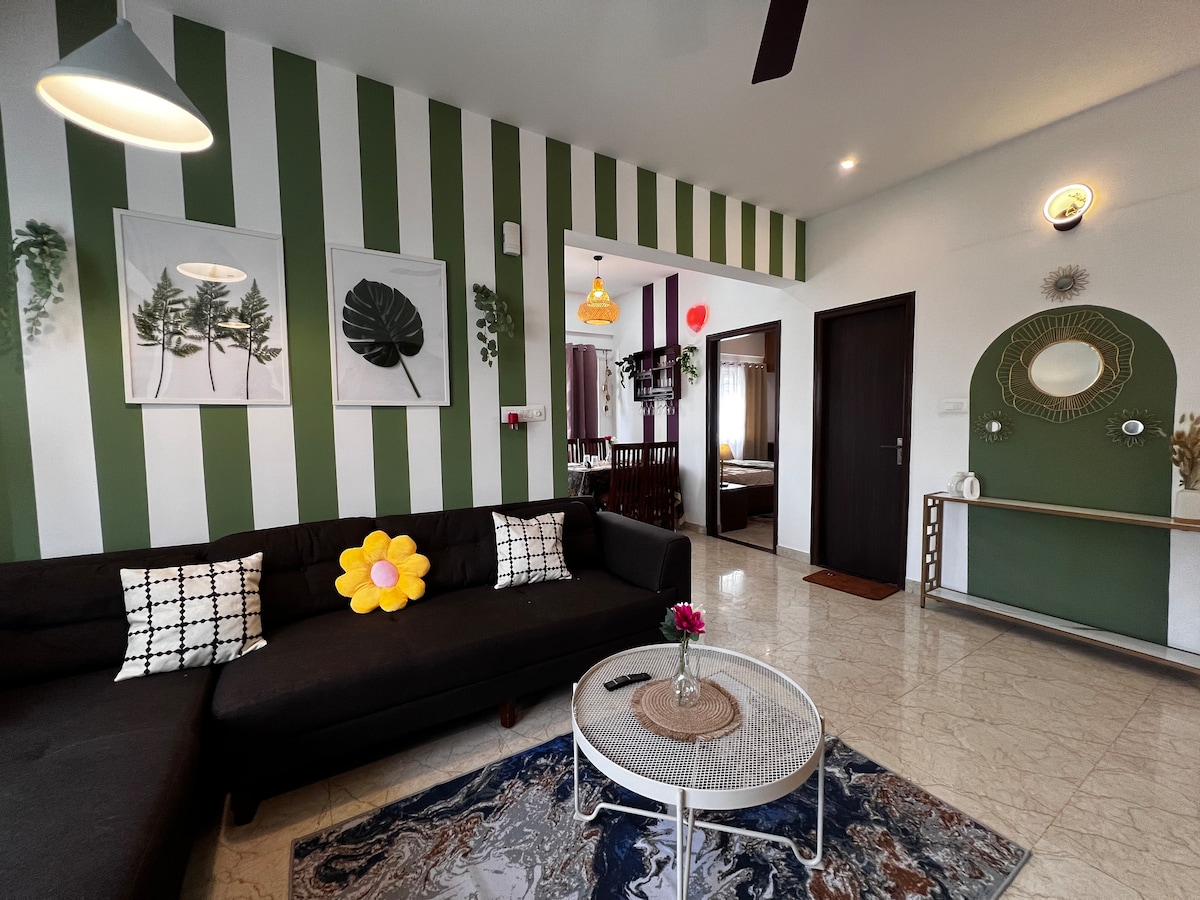 Örömmel látunk vendégül az 1 BHK (EARTHY Homestay) szálláshelyünkön, amely a stílust földhözragadós, békés hangulattal és verhetetlen panorámával ötvözi. - Oázis erkély: kilátás az erdőre + mozi naplementék 200 méteren - Kiváló elhelyezkedés: 2 perc a NIFT-től és 3 perc a 27th Main kávézóitól, butikjaitól és utcai ételeitől – Nyugodt belső terek: Queen méretű ágy, hangulatos világítás és buja élő növények – Munka és játék: nagy sebességű Wi-Fi, nagy TV és friss levegő Stílus, nyugalom és látványos naplementék – mindez egy hangulatos szálláshelyen! - 5. emelet (nincs lift)