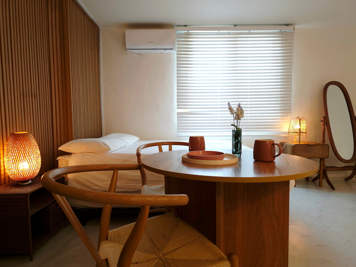 Minden szoba egy stúdióból áll, amely tiszta és érzelemmel teli, és 3 perces sétára található a KTX Gangneung állomás 1-es kijáratától, és áthalad a zebrán. Ha belépsz a második emeleti szálláshelyre, miután elhaladtál egy rendezett külső és előcsarnok mellett, amely egyértelműen kiemelkedik a közeli területhez képest, kényelmesen pihenhetsz egy rendezett és rendezett belső térben. Könnyen megközelíthető tömegközlekedéssel a tengerhez, és gyalog 10 perc alatt elérhető a Wolhwa Street, Gangneung népszerű helye, valamint 15 perc sétára a Jungang Market Food Village-től. Készíts még egy emléket egy különleges szálláshelyen, amely jó ár-érték arányú és rendezett.