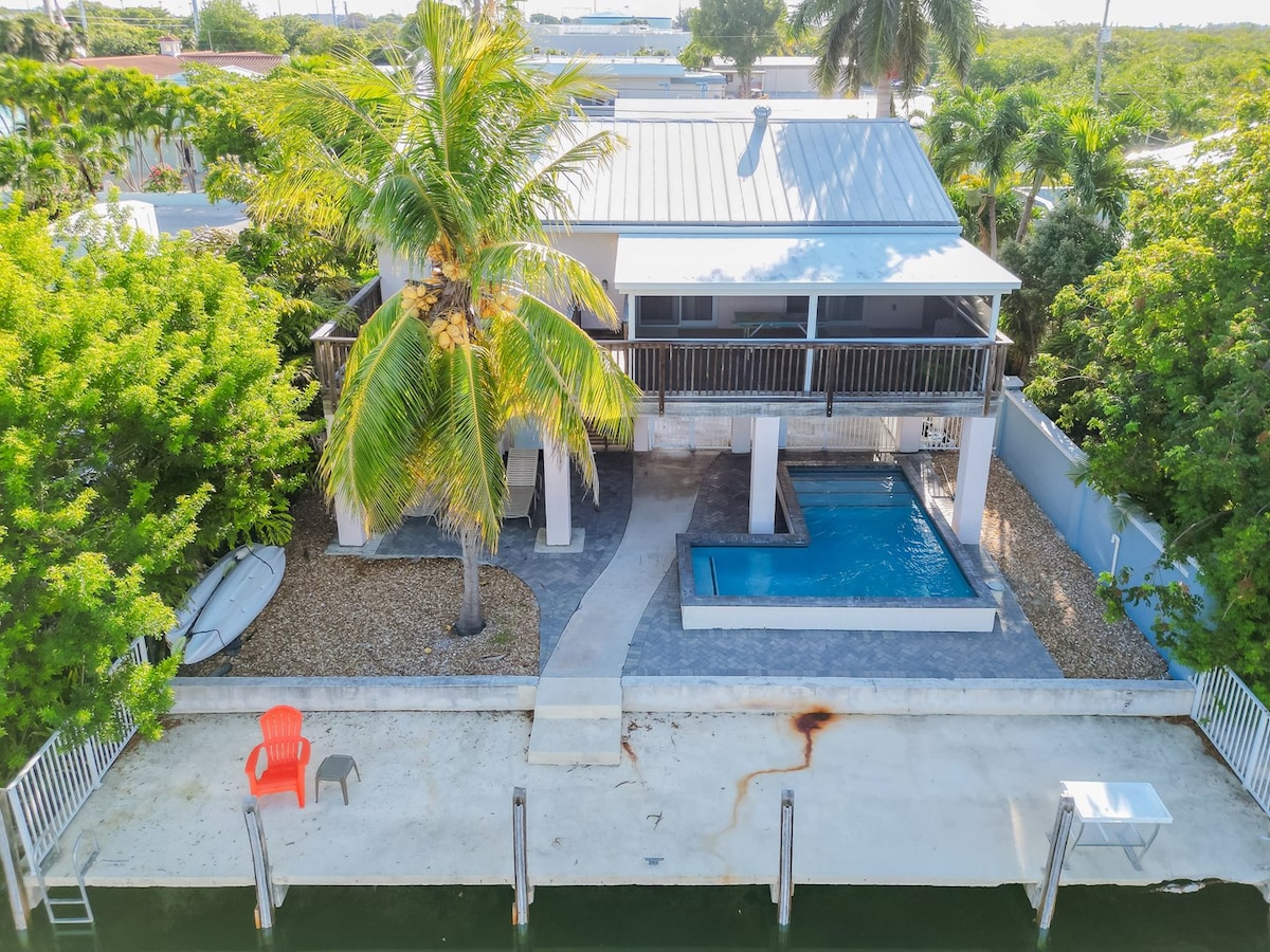 Amazing get-away in the beautiful Florida Keys! This property (constructed in 2018) is a haven for families seeking to escape to paradise year-round. Situated on a deep water canal with ocean access and enough dock space to park your boat for the week. A floating dock is also provided with kayaks and a paddle-board. Enjoy the large pool or ping pong table, or lounging in the sun! Beautiful Sombrero Beach is within walking distance (approx 1.5 miles) via a paved bike path.