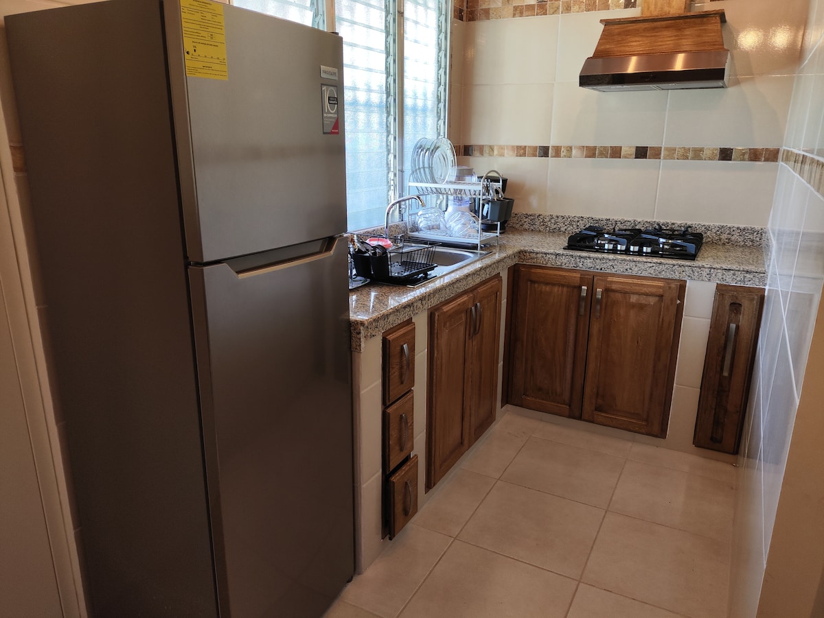 Very comfortable apartment just 2 minutes from downtown Bugaba. The apartment is a 2-minute drive from supermarkets (Romero, Super 99, Super Extra 24h) and restaurants (traditional Panamanian, McDonald's, Domino's Pizza, Little Caesar's). It comfortably accommodates 5 people and consists of 1 bedroom with a king-size bed, 1 queen-size bed, and 1 sofa bed, a 50" Smart TV and a full bathroom with a hot shower. Fully equipped kitchen with stove, oven, refrigerator, and kitchen utensils.