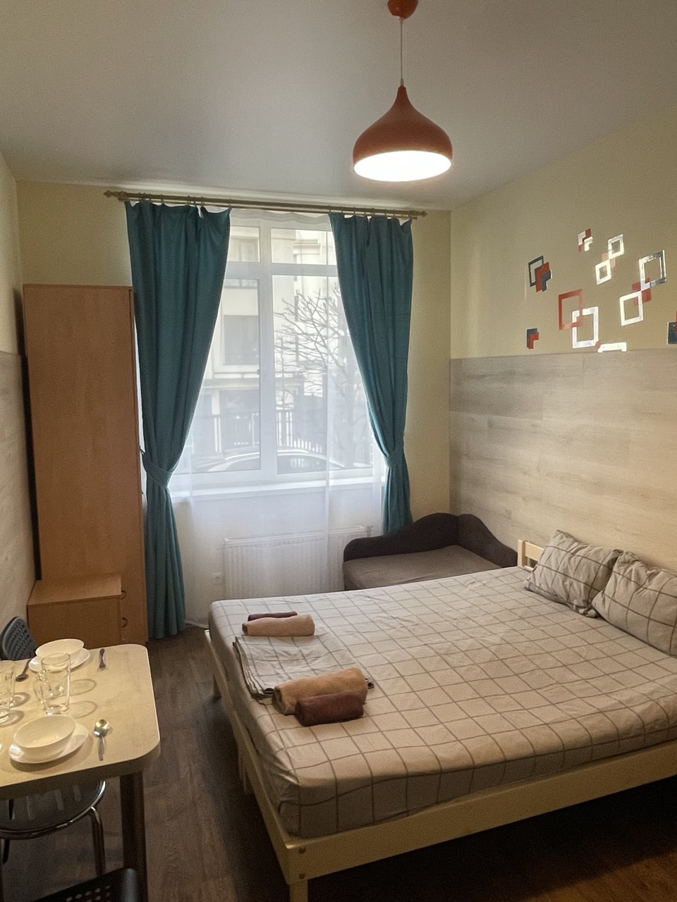 Kis, hangulatos lakás egy új épület 1. emeletén a Rich Town lakókomplexumban. A lakásban franciaágy található. Tökéletes egy párnak. Ha külön ágyakra van szükség, különálló egyszemélyes ágyakká alakítható. Konyha: hűtőszekrény, multicooker és vízforraló. Wi-Fi elérhető. A lakásban van fürdőszoba zuhanytálcával. A három stúdió folyosóján mosógép, vasaló és vasalódeszka található, amelyeket ingyenesen használhatsz. Ingyenes ágyneműt és törölközőt biztosítunk.
