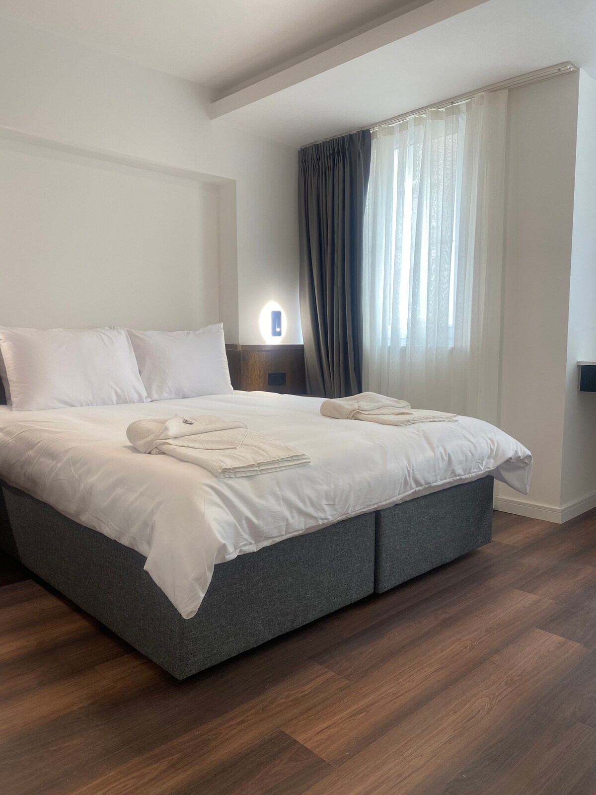 Szobánk fényűző, modern és gondosan megtervezett. Szállodánkban található szoba nagy franciaággyal, 43 hüvelykes okostévével és saját fürdőszobával rendelkezik. Szobánkban van egy kis konyha minihűtővel és kis konyhai felszereléssel. A szobánk a 3. emeleten található. Éjjel-nappali kamera és biztonsági rendszer áll rendelkezésre. Az épület külső ajtaja speciálisan kódolt és védett. A szobánkat 2 fő elszállásolására terveztük.