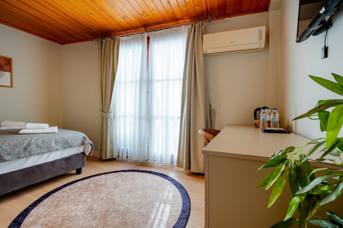 A történelmi textúrával átgondoltan berendezett egyedi szoba a modern kényelmet és a nosztalgikus hangulatot ötvözi. Kellemes időtöltést kínál egyedi tervezésű fabútorokkal, meleg világítással és eredeti falrészletekkel. Ez a szoba mindössze 1 perc sétára található az Istiklal utcától és 3 perc sétára a metrótól. Ez a szoba nagyszerű választás azoknak, akik szeretnék felfedezni a város energiáját.