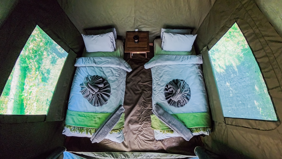 Our newly appointed Meru tents (sleep 2) with en suite toilets and open air showers are set in a shady spot at Sitatunga. Inside the tent you find twin beds with Mosquito nets, bed side tables with a kettle and a fan. the back door is a zip up that leads out onto the en suite shower and ablutions.