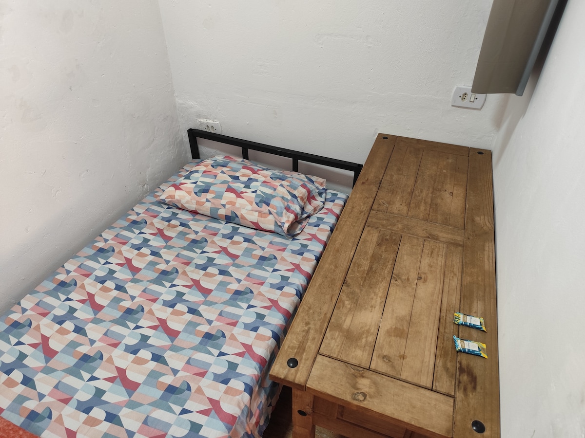 Quarto individual com WiFi incluído. Ambiente familiar, tranquilidade para estudar, trabalhar ou relaxar, com ventilador para seu conforto. Este quarto é privativo, somente você estará hospedado nele, porém, o banheiro é coletivo e fica bem ao lado do quarto. Temos no total de 4 banheiros na pousada, todos os banheiros são lavados todos os dias garantindo a higiêne em primeiro lugar. Por sermos uma pousada pequena com poucos hóspedes, sempre terá banheiro disponível para sua utilização.