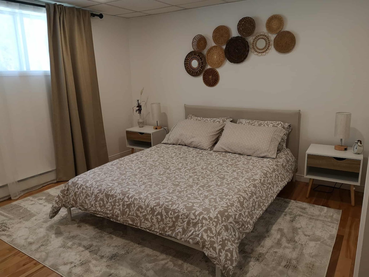 Teljesen felszerelt lakás, fél alagsor egy lakóövezetben, nyáron hűvös és télen meleg (fali légkondicionálással) - 3 percre a Mont St-Bruno síközponttól. - 2 percre az alapvető üzletektől (élelmiszerbolt, gyógyszertár, éttermek) és egy nagy park szabadtéri medencével és sportpályákkal. - 25-30 perces autóútra Montreal központjától. - 2 percre a Parc du Mont St-Brunótól.