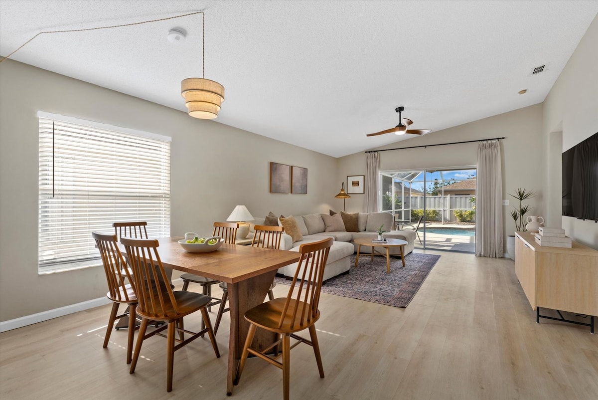 Enjoy your little slice of paradise at the beautifully decorated Orange Oasis! 3 bedrooms & 2 baths, plus a daybed with trundle. Heated Pool. High speed wifi & 4 TV's all with Hulu, Apple TV, Disney+, & ESPN. Vaulted ceiling, rainfall walk-in shower, washer & dryer, large fenced backyard, pool, garage parking, Weber grill, & a quiet safe neighborhood. The home comes fully stocked with Ziploc bags, cooking/kitchen essentials, coffee, beach essentials, & outdoor/indoor games.