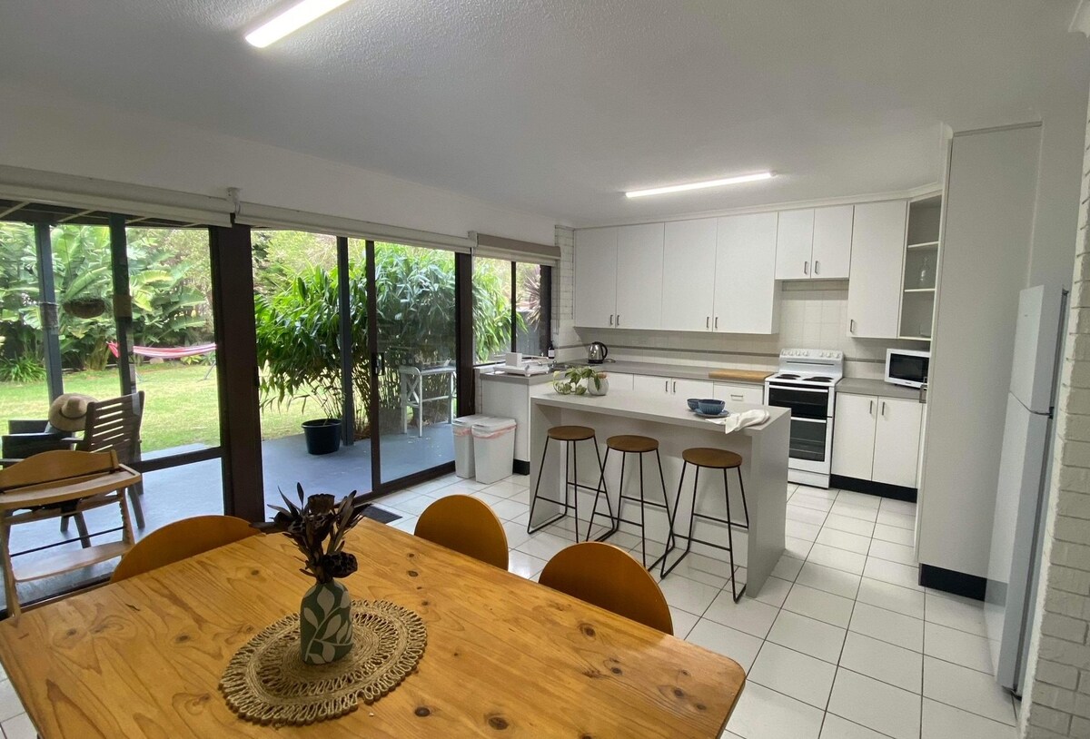 Forget your worries in this spacious and serene pet friendly family space. Located in a very quiet street in old broulee and only 500 meters flat and easy walk to south broulee beach. Recently fully renovated well equipped home with 3 good sized queen bedrooms and reverse cycle aircon throughout. Self check in provided via a lock box so late arrivals are not a problem . Fast NBN wifi is available with the password as well as Telstra tv box so you can access all your entertainment accounts mal