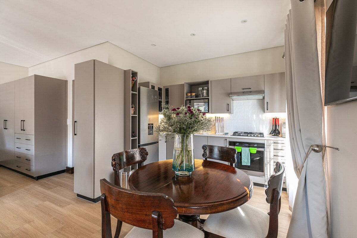 Élvezd a biztonságos és stílusos szállást ebben a modern, két hálószobás lakásban, közel az O.R. Tambo repülőtérhez. Élvezd a 24 órás helyszíni biztonsági őrök és a kényelmes 24 órás bejelentkezés, az ultragyors Wi-Fi, a légkondicionálás és a szünetmentes tápegységgel biztosított áramellátás előnyeit, amelyek megszakítás nélküli kapcsolatot és töltést biztosítanak az áramkimaradások során. Készítsd el az ételeket könnyedén a gáztűzhelyen, és élvezd a napenergiával fűtött zuhanyzó kényelmét. Tökéletes üzleti utazóknak és családoknak, akik kényelmet, biztonságot és nyugalmat keresnek.