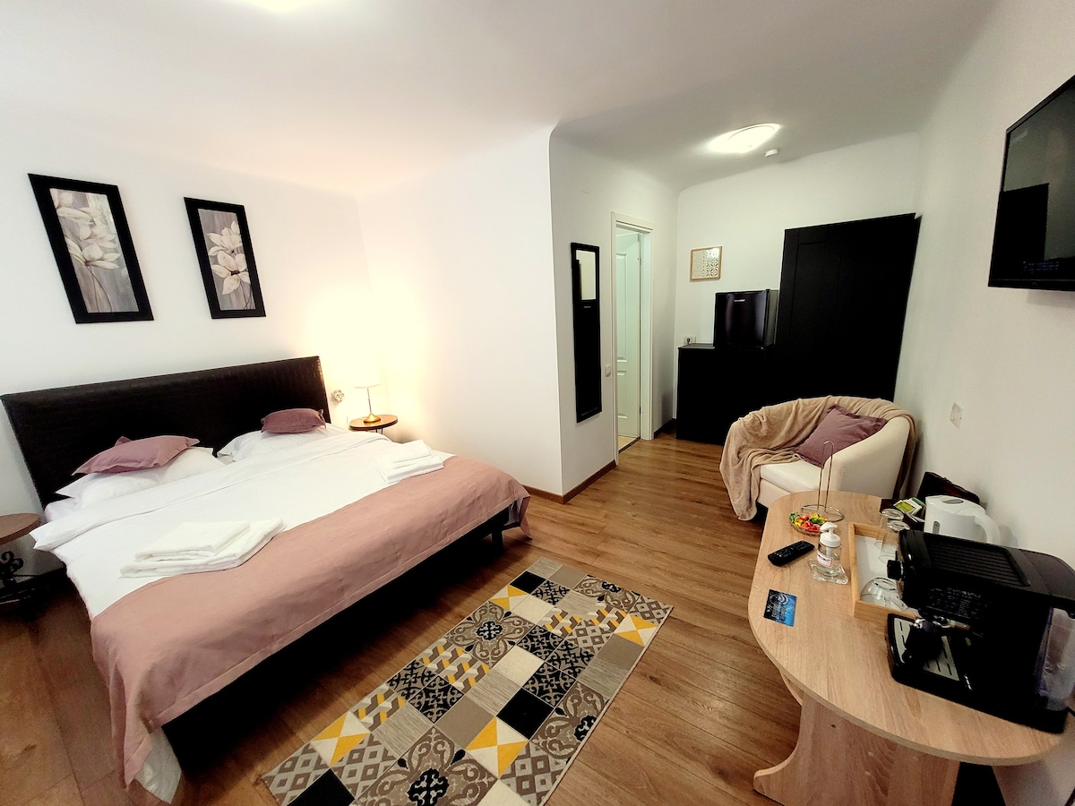 Található a városközpontban, Stúdió , 35sqm ,álló hálószoba nagy franciaággyal, saját fürdőszobával és konyhával. Ideális pároknak vagy egy személynek. A maximális befogadóképesség 2 hely. A konyha fel van szerelve elektromos tűzhely, mikrohullámú sütő, vízforraló, eszpresszó kávéfőző, hűtőszekrény . Ingyenes WI |, TV. Az edzőteremben a vendégek ingyenesen vehetik igénybe a szálláshelyet.Az épület előtti parkolóhelyek ingyenesek.