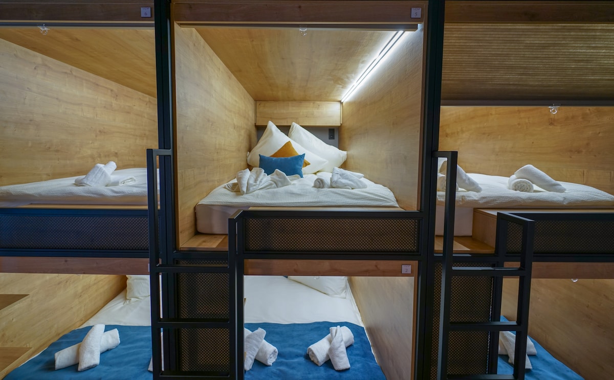 This Classic Capsule in mixed bedroom with Capsules provides comfortable solution in CHORS. Classic Capsule feautres Front Upper Entry. It provides ideal privacy with everything right in your Capsule, including socket for charging, LED lighting, key card locker with hangers, multiple shelves and blinds for privacy. Room with this Capsule is equipped with designer lamps, two desks, two comfortable chairs and three luxurious velvet armchairs. This room has outside shared bathroom.