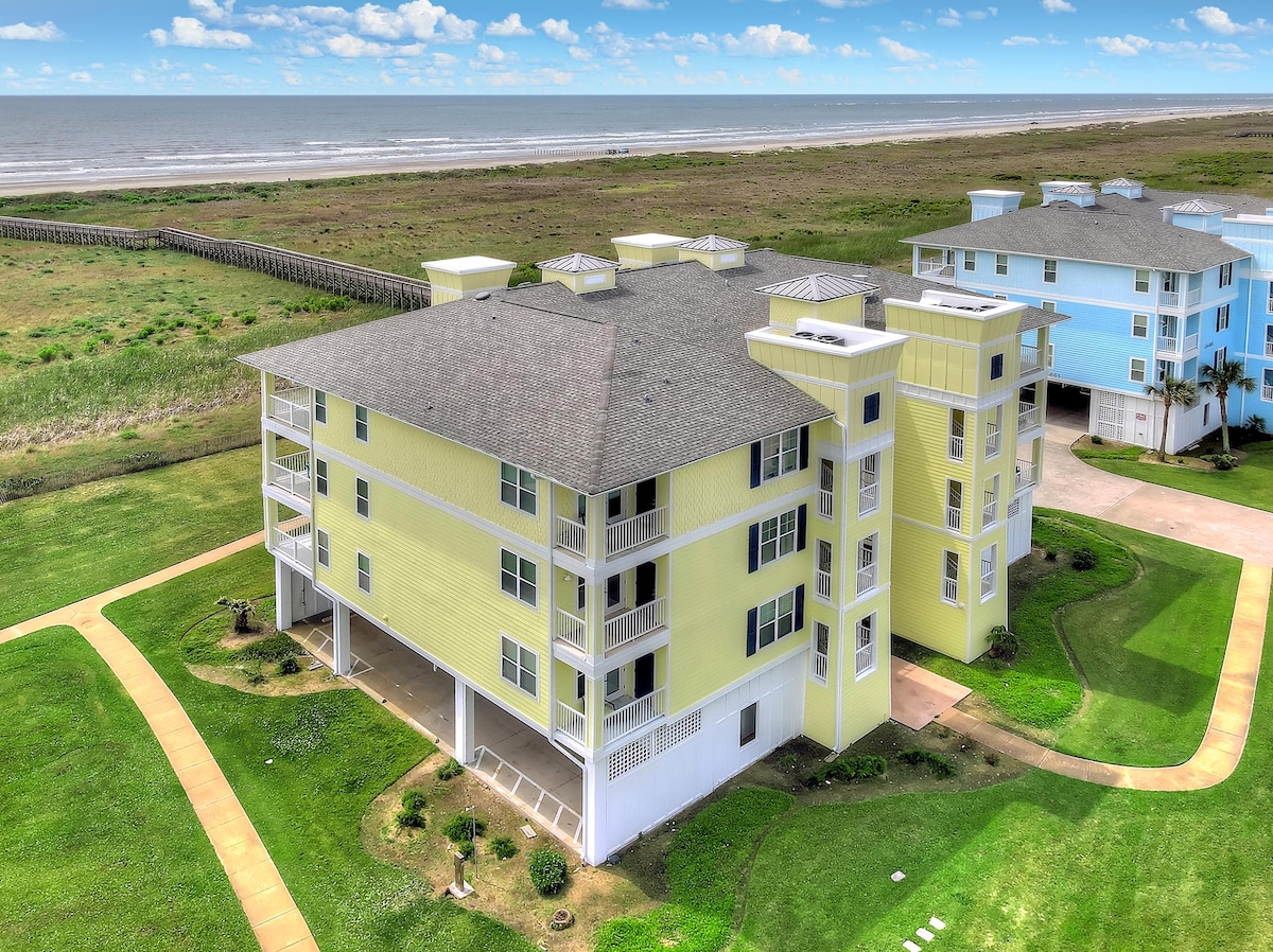 Best VIEWS, best location, best vacation spot on Galveston Island! It doesn't get better than this premier BEACH FRONT 3BR/3B condo at Pointe West- take in the unparalleled, 180-degree gulf views while being just steps away from both BEACH and POOL access. With 3 bedrooms, 3 full bathrooms, 2 living areas, and a well-stocked kitchen, everyone can have their own space to relax and enjoy the views or to enjoy time together.