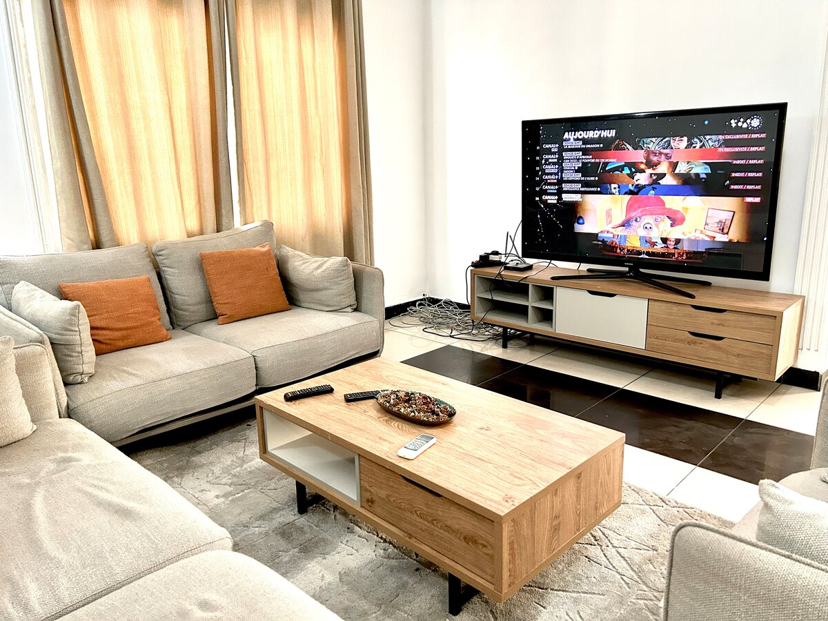 • Stunning apartment fully furnished, within two bedrooms, a living room, a kitchenette area, a bathroom and modern toilets. • It has a large 55” QLED screen with Netflix and WiFi connection. • A day and night guard, a 24/7 cleaning service, secured by an alarm system and an electric fence as well as CCTV cameras. • An electronic generator in the event of a power outage, a water batch, and a private parking.