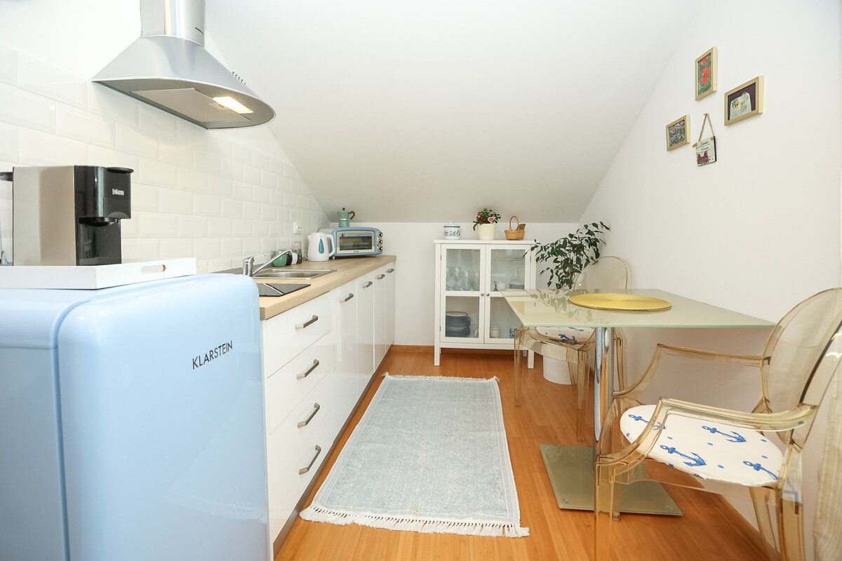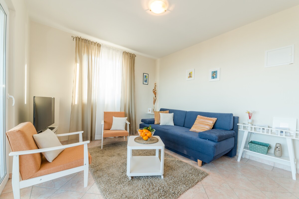 Welcome to a cozy, ground floor, fully equipped 2-bedroom apartment for up to 4 people 350 m from the beach, with free parking, your own covered terrace, and all assistance you need. There is also at your disposal a courtyard with a garden of Mediterranean herbs and a barbecue with a summer kitchen situated in the shade of olive trees and grape vines (if you like to cook outside). We will do our best to make your stay with us pleasant.