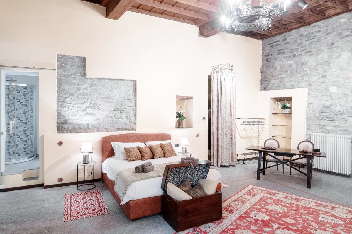 Historical Baroque Suite is an exclusive large room of 60sqm located in an ancient building, right in the historic center of Como. The room is distinguished by a refined decor and full of authentic antiques, immersed in a timeless atmosphere, between medieval walls and fine fabrics. Our Suite is the perfect place to enjoy the magic and romance of the lake and the beauty of Como, in a unique place in the heart of the city, to visit with our bikes!