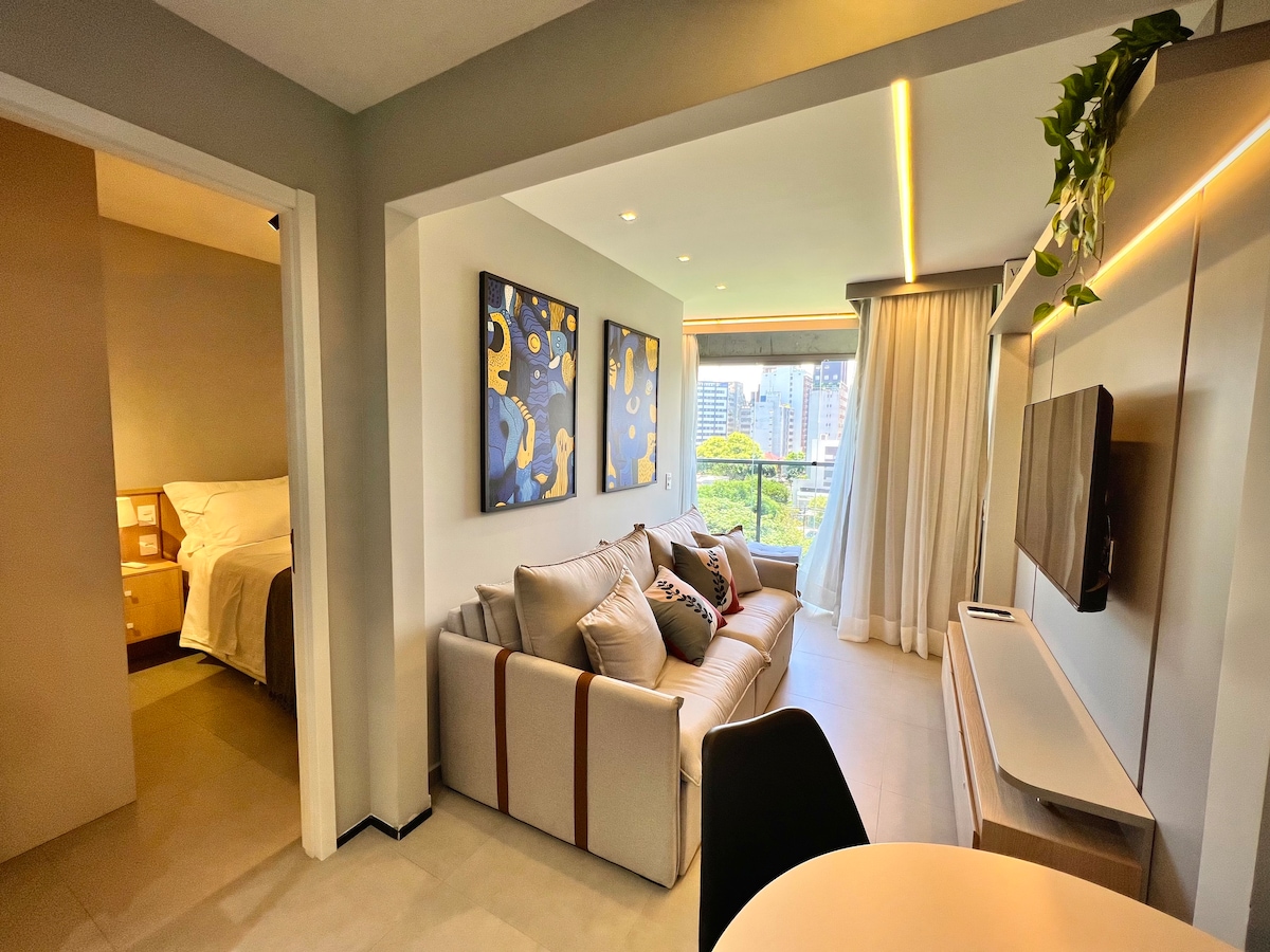 Stay in a hotel-style flat in the heart of Itaim Bibi Comfort, convenience, and a prime location, just minutes from Ibirapuera Park, restaurants, bars, and São Paulo’s business centers Ideal for those seeking a hassle-free stay, whether for work or leisure The suite is cozy and quiet, with a comfortable bed, perfect for a great night’s sleep The building offers full amenities, including daily housekeeping, parking, gym, swimming pool, sauna, restaurant, and 24-hour bilingual reception