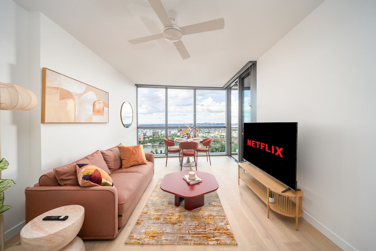 Our apartment is set on level 20 rising high above the city with 180° uninterrupted views of the beautiful Brisbane river from the living room. Thoughtfully decorated and furnished, this apartment will be the perfect base for you to explore and experience all that beautiful South Brisbane has to offer. Leave your car parked and walk to South Bank Parklands , GOMA, QPAC, Star Casino and experience the wonderful restaurants of South Brisbane and West End. A 15 walk to Suncorp stadium!