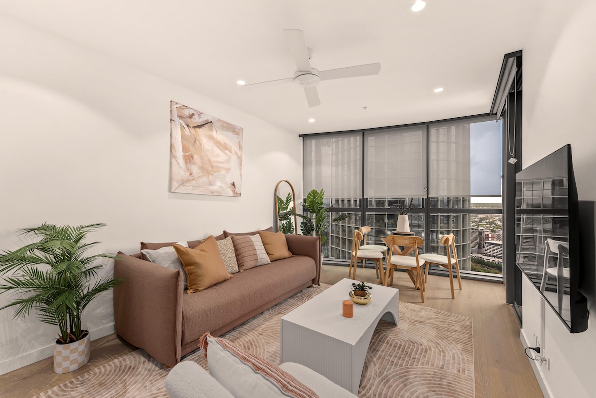 Szállj fel a város fölé, és lazíts a New Queen's Wharf nyugodt, egekbe törő luxusában. Az 59. emeleten található, gyönyörűen válogatott, vadonatúj apartman a természet ihlette, megnyugtató belső terekkel és Brisbane látképének, folyójának és hegyeinek lélegzetelállító, zavartalan kilátásával ötvöződik. Lépj be egy nyugodt térbe, ahol a lágy, földszínű tónusok, a természetes textúrák és a luxuskivitel tökéletes pihenést biztosítanak – akár üzleti ügyben, akár romantikus kiruccanásra, akár békés kikapcsolódásra érkeztél a város szívébe.
