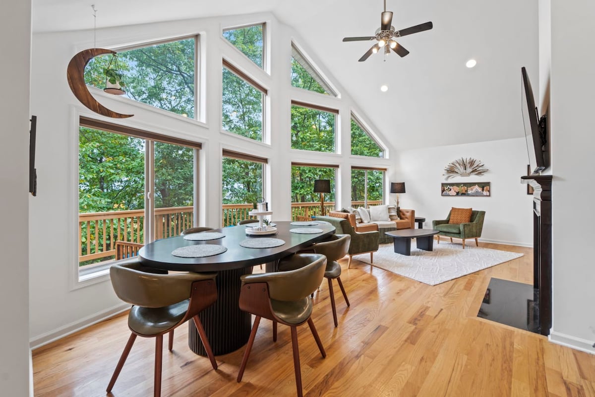 Ez a magas dombon álló gyönyörű faház fákkal van körülvéve, és hatalmas, körbefutó terasszal, PEZSGŐFÜRDŐVEL, fatüzelésű kandallóval, hatalmas intelligens tévékkel, valamint felnőtteknek és gyerekeknek szóló JÁTÉKTEREMMEL rendelkezik, ahol minden elképzelhető szórakoztató játék megtalálható - medence, pingpong, PacMan videoárkádok, darts és sok minden más. Minden ágy új, és vannak king méretű ágyak és trundle ágyak, amelyek minden korosztály számára alkalmasak. Felhívjuk figyelmedet, hogy az első kutya után 75 $, a második/harmadik kutyáért pedig 25 $/ea felárat számítunk fel (a második/harmadik kutyadíjat később számítjuk fel).