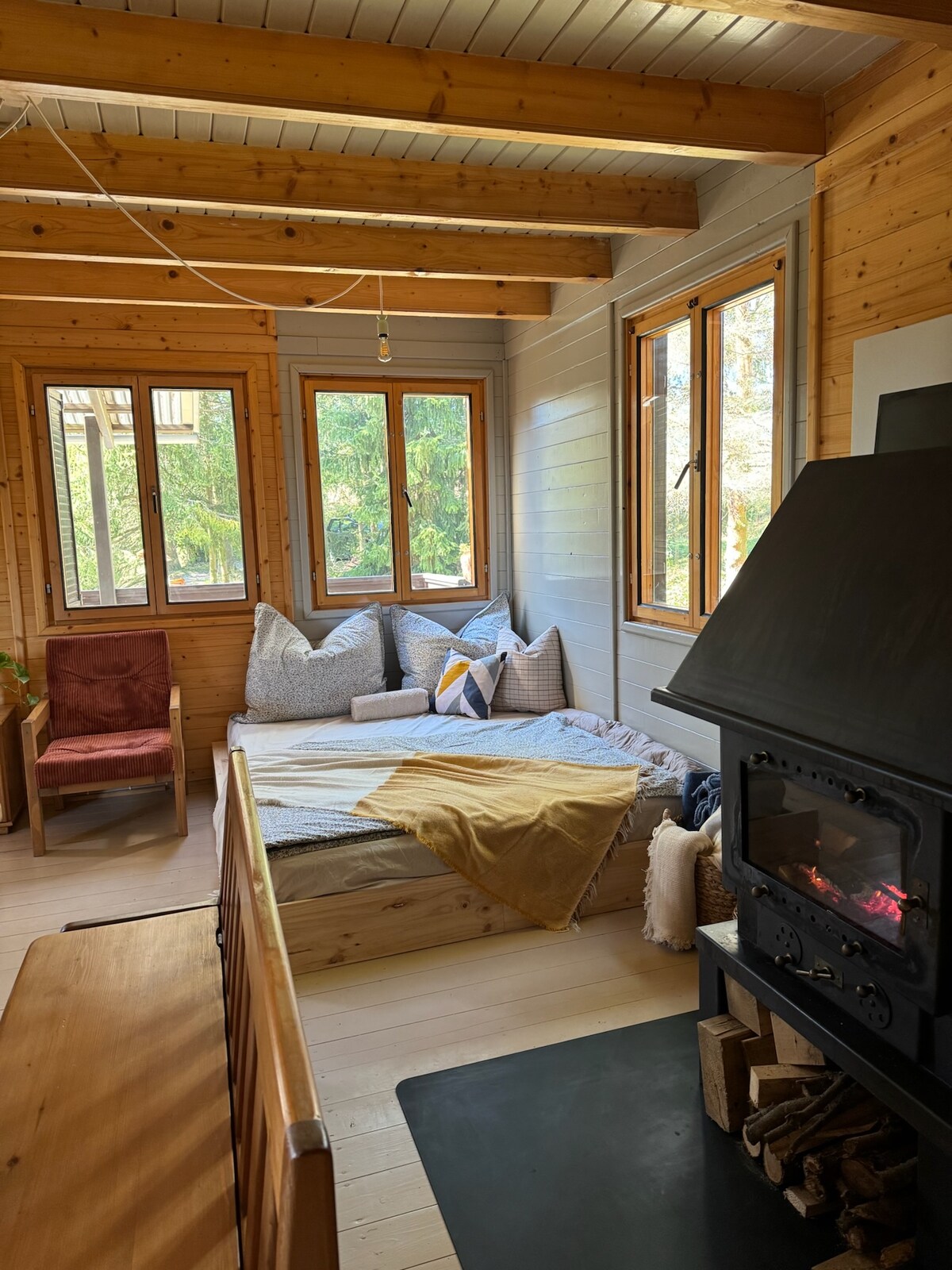 Fedezzen fel egy helyet, ahol a béke és a természet uralkodik. A tágas kertben található két faház csodálatos kilátást nyújt a környező erdőkre és a naplementére. Pihenjen a teraszon, gyakoroljon jógát, vagy élvezze az estét a tűzrakóhely mellett. Minden házban akár 4 fő is elfér. Egy hálószoba franciaággyal, egy nappali kihúzható kanapéval, egy konyha és egy fatüzelésű kályha található. Hagyja otthon a gondjait, élvezze a magának való pillanatokat, és távozzon kipihenten és tele energiával.