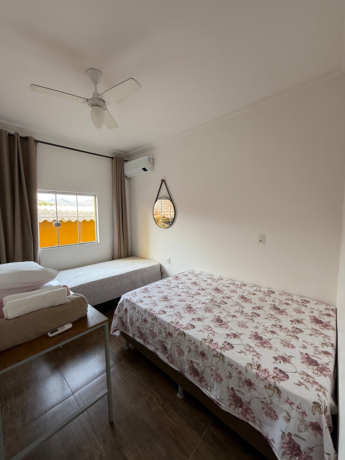 Excelente suíte com varanda, ar condicionado, TV e frigobar, para até 3 pessoas, com 1 cama de casal e 1 de solteiro.