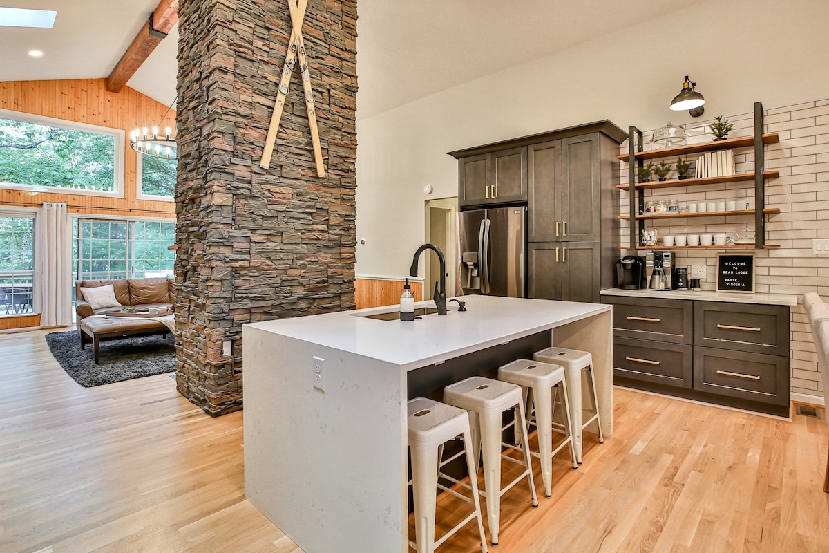 A Shenandoah-hegységben található, egy csillogó tó felett, lépj át 2 kézzel faragott ajtón, hogy melegen üdvözölhesd a tágas 5 hálószobás, 5 fürdőszobás otthonunkban. ✓ Beszélgető gödör és lebegő kandalló székesegyházi mennyezettel ✓ Teljes konyha, felszerelt és készen áll ✓ Fürdőszoba minden hálószobához ✓ 6 kényelmes ágy ✓ 3 játékszoba (léghoki, darts, csocsó és medence) ✓ 6 fedett fedélzet ✓ 50hüvelykes TV Rokuval ✓ Teljes méretű mosógép/szárítógép ✓ Gyors internet az otthoni munkavégzéshez