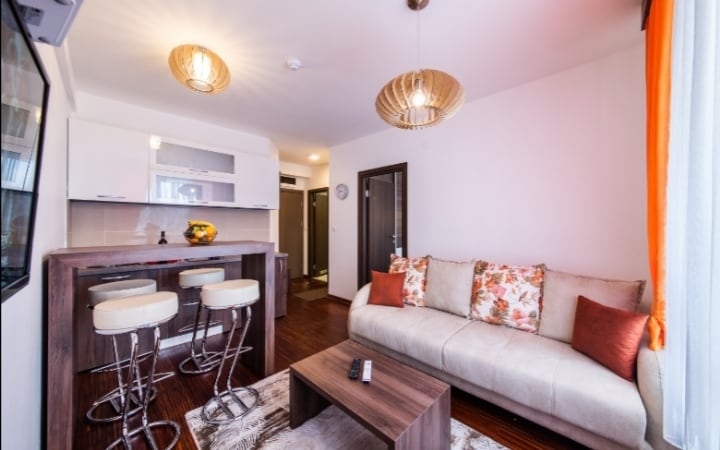 Apartment is within KRALJEVI CARDACI aparthotel, Kopaonik, Serbia. New building was established in 2018 and this apartment is located in new part, just above the pool and extra spa center. Apartment is private property, functioning within Kraljevi cardaci, but also via AirBnB.