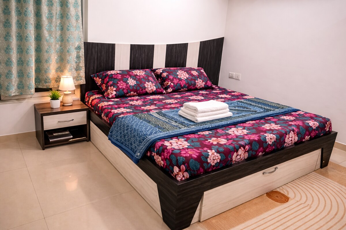 Örömmel látunk vendégül az 1 BHK (EARTHY Homestay) szálláshelyünkön, amely a stílust földhözragadós, békés hangulattal és verhetetlen panorámával ötvözi. - Oázis erkély: kilátás az erdőre + mozi naplementék 200 méteren - Kiváló elhelyezkedés: 2 perc a NIFT-től és 3 perc a 27th Main kávézóitól, butikjaitól és utcai ételeitől – Nyugodt belső terek: Queen méretű ágy, hangulatos világítás és buja élő növények – Munka és játék: nagy sebességű Wi-Fi, nagy TV és friss levegő Stílus, nyugalom és látványos naplementék – mindez egy hangulatos szálláshelyen! - 5. emelet (nincs lift)