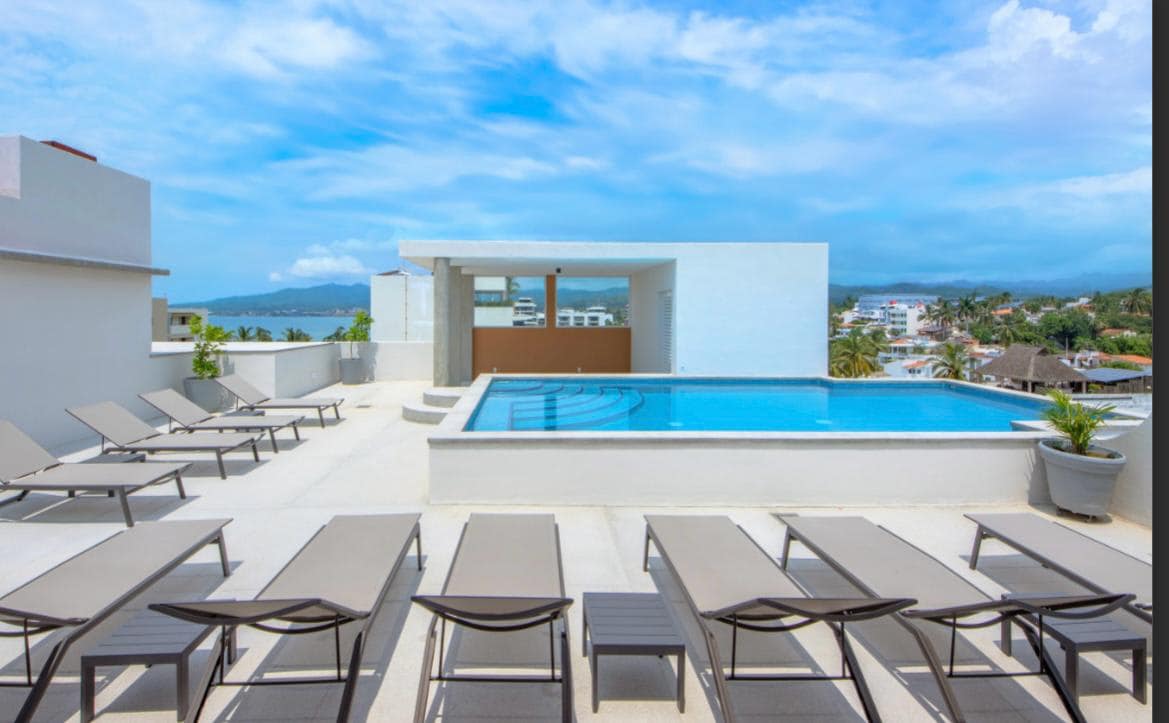 Merülj el az elegancia és a nyugalom világában Bucerias új és exkluzív tengerparti épületeiben. - Fűtött medence - Jacuzzi pezsgőfürdővel - Étterem óceánparti bár - Fedett parkoló és nonstop biztonsági szolgálat - Nagy sebességű Wi-Fi az egész lakásban - Játékok negyede, köztük biliárd, pókerasztal és óriás képernyős szoba - Tetőterasz gyönyörű kilátással – Tűzrakóhely a tengerhez - Camamák és nyugágyak - Grillezőhely - Edzőterem és gyógyfürdő