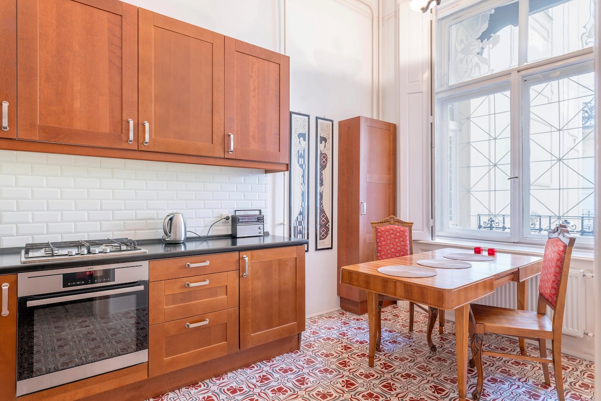 Have you ever dreamed about an artist's extravagant studio? Feel the vibe and try a famous Hungarian painter Lajos Vajda's renewed studio loft, facing the city biggest park Városliget. Park for free in our underground garage and cook in our kitchen with striking wood cabinets and exposed brick. A factory-chic chandelier hangs above a modern dining table while a living area basks in natural light from industrial windows. Beautifully designed in 100 -years-old house, near to Heroes square.